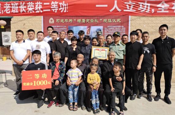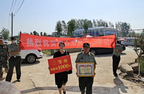 (李新建 劉建國)9月18日,在這個特殊的日子,河南駐馬店正陽縣慎水鄉(xiāng)王牌村熱鬧非凡、鑼鼓喧天,鞭炮齊鳴,中國人民武裝警察部隊獵鷹突擊隊特戰(zhàn)訓練大隊對抗中隊中隊長熊志亮家迎來了二等功軍章。在正陽縣人民武部政委胡春雷的帶領下,縣軍人事務局領導和武警官兵一起,高舉“祝賀熊志亮同志榮立二等功”橫幅、二等軍功章牌匾和千元慰問金送到家屬手中。