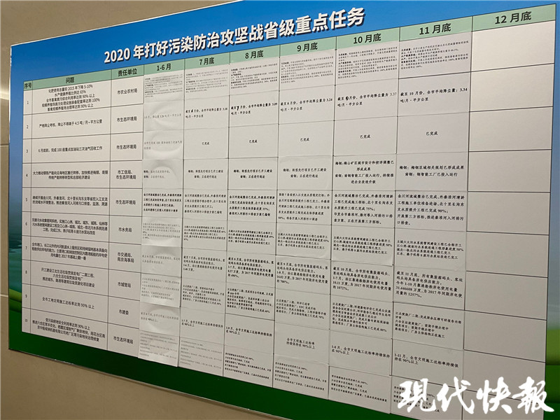 在南京新城大廈20樓,辦公室的走廊墻壁上貼了十塊展板,內(nèi)容是“2020年打好污染防治攻堅(jiān)戰(zhàn)省級(jí)重點(diǎn)任務(wù)”,一共100項(xiàng)任務(wù),按時(shí)間表分解,一目了然。以“降塵考核”為例,目標(biāo)是:降塵不得超過(guò)4.5噸/月.平方公里,責(zé)任單位是南京市生態(tài)環(huán)境局,每個(gè)時(shí)間節(jié)點(diǎn)都準(zhǔn)確標(biāo)注著任務(wù)的完成情況。截至2020年10月,南京的降塵量為3.34噸/月.平方公里……