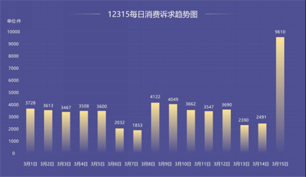 3月15日當天,全省12315熱線平臺接收消費者訴求9610件,占3·15期間受理總量的17.37%,同比上升33.47%。3月15日當天的單日受理量位居首位,是3·15期間其他時間段單日受理量的兩倍。