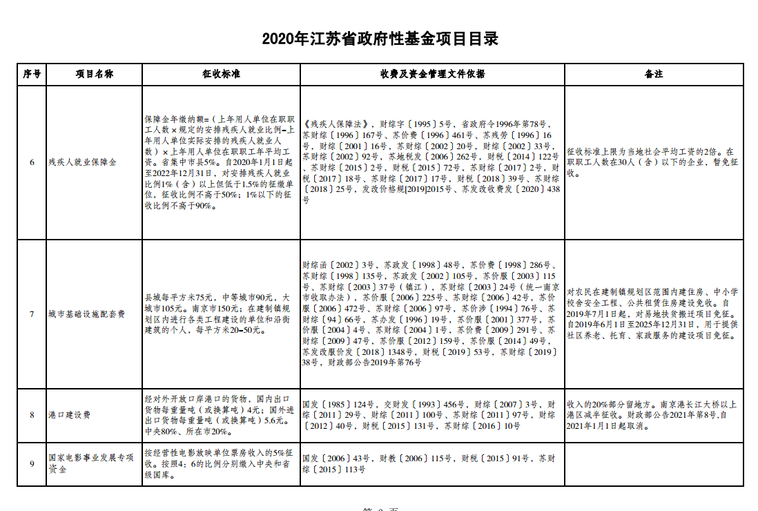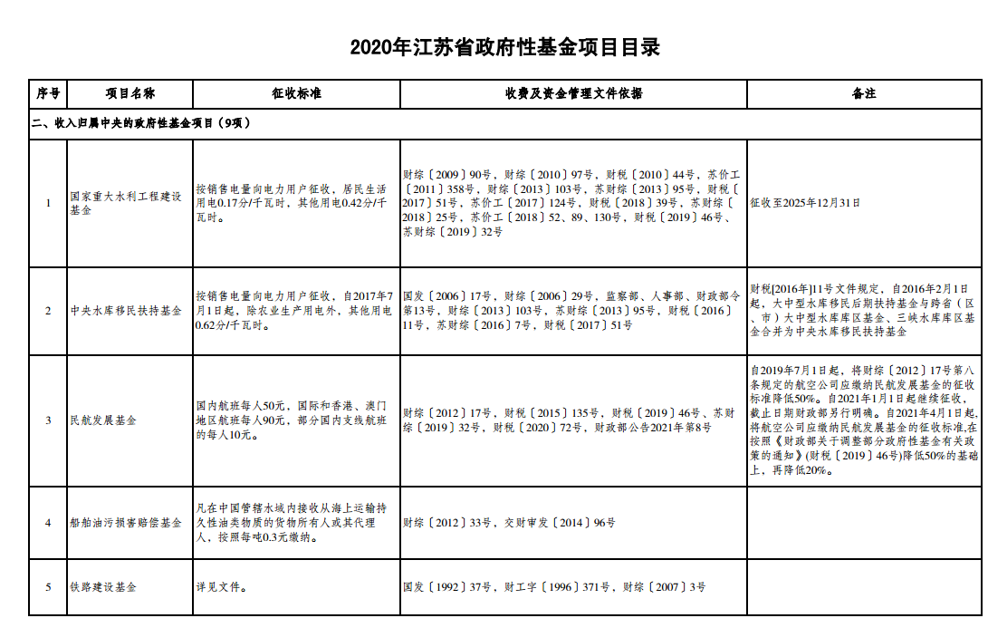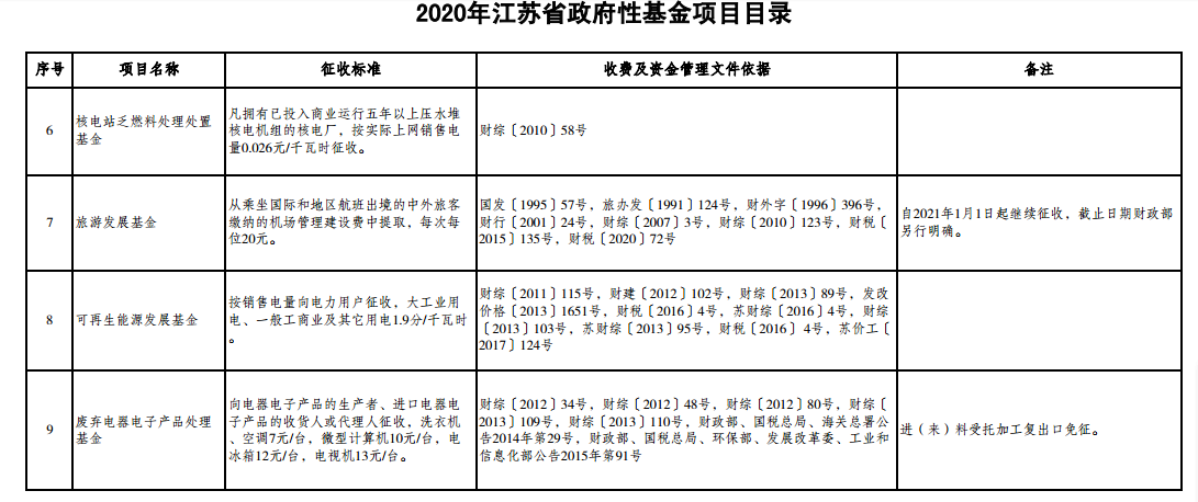 據(jù)悉,《基金目錄》中公布的18項政府性基金項目是截至2020年12月31日在江蘇省境內(nèi)征收的政府性基金項目,按照其收入歸屬關(guān)系分為兩類:一類是收入歸屬地方(或地方參與分成)的政府性基金項目(共9項)。具體包括森林植被恢復(fù)費、水利建設(shè)基金、文化事業(yè)建設(shè)費、教育費附加、地方教育附加、殘疾人就業(yè)保障金、城市基礎(chǔ)設(shè)施配套費、港口建設(shè)費、國家電影事業(yè)發(fā)展專項資金;另一類是收入歸屬中央的政府性基金項目(共9項),具體包括國家重大水利工程建設(shè)基金、中央水庫移民扶持基金、民航發(fā)展基金、船舶油污損害賠償基金、鐵路建設(shè)基金、核電站乏燃料處理處置基金、旅游發(fā)展基金、可再生能源發(fā)展基金、廢棄電器電子產(chǎn)品處理基金。