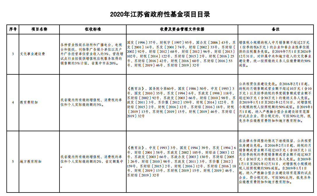 《通知》中指出,2020年1月1日起,江蘇省各級各部門和單位的基金項目,一律以《基金目錄》為準(zhǔn),具體征收范圍、征收標(biāo)準(zhǔn)、征收期限、資金管理方式等,應(yīng)嚴(yán)格按照《基金目錄》中注明的有關(guān)文件規(guī)定執(zhí)行,嚴(yán)禁各級、各部門擅自增加項目、提高標(biāo)準(zhǔn)、擴大范圍。凡未列入《基金目錄》的政府性基金項目,一律作為取消項目處理,各級、各相關(guān)部門應(yīng)當(dāng)停止執(zhí)行,公民、法人和其他社會組織有權(quán)拒絕支付。