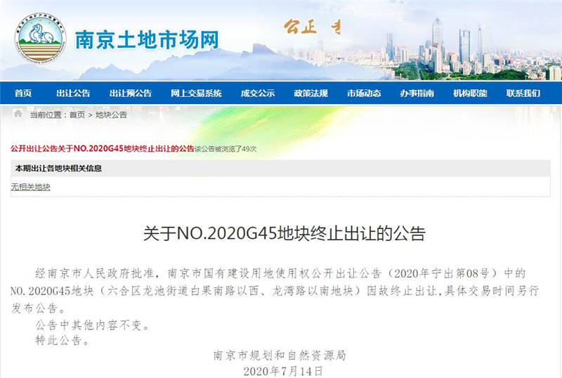 早在6月12日,南京掛出10幅涉宅地塊,要求按照“限房?jī)r(jià)、競(jìng)地價(jià)”的方式出讓。7月14日,南京市規(guī)劃和自然資源局發(fā)布公告稱(chēng),經(jīng)南京市人民政府批準(zhǔn),南京市國(guó)有建設(shè)用地使用權(quán)公開(kāi)出讓公告(2020年寧出第08號(hào))中的NO.2020G45地塊(六合區(qū)龍池街道白果南路以西、龍灣路以南地塊)因故終止出讓,具體交易時(shí)間另行發(fā)布公告。