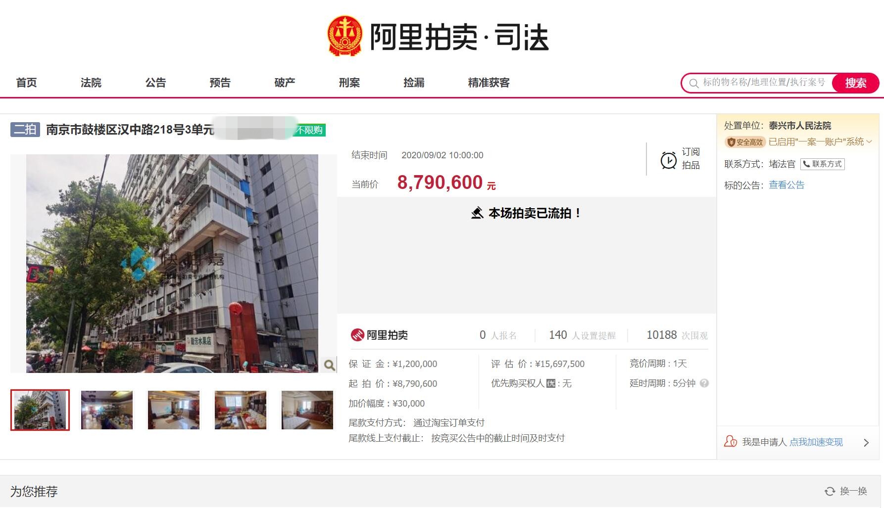此前,在8月11日,泰興市人民法院對該房產(chǎn)進行了第一次司法拍賣,當時的起拍價為1098萬,單價為54163元/㎡,不過一直無人報名,最終流拍。9月1日,這套房產(chǎn)進行了第二次拍賣,這次拍賣價格比市場評估價降了690余萬,以879.06萬底價起拍,單價僅為43331元/㎡,相當于市價的5.5折左右。參與競拍的人需要繳納保證金120萬元,加價幅度為3萬。