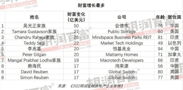 57位房地產(chǎn)企業(yè)家財(cái)富比去年增長,其中增長最多的是來自中國的會德豐76歲吳光正,增長了300億元;其次是美國Public Storage 60歲的Tamara Gustavson,增長了200億元。