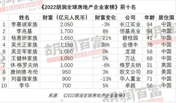 4月6日,胡潤研究院發(fā)布《2022胡潤全球房地產(chǎn)企業(yè)家榜》。榜單顯示,前十名上榜門檻為700億元,8位來自中國,其中香港首富長江實(shí)業(yè)94歲的李嘉誠以2050億元的財(cái)富成為全球房地產(chǎn)首富;恒基兆業(yè)94歲的李兆基以1700億元排名第二;碧桂園41歲的楊惠妍以1650億元排名第三。