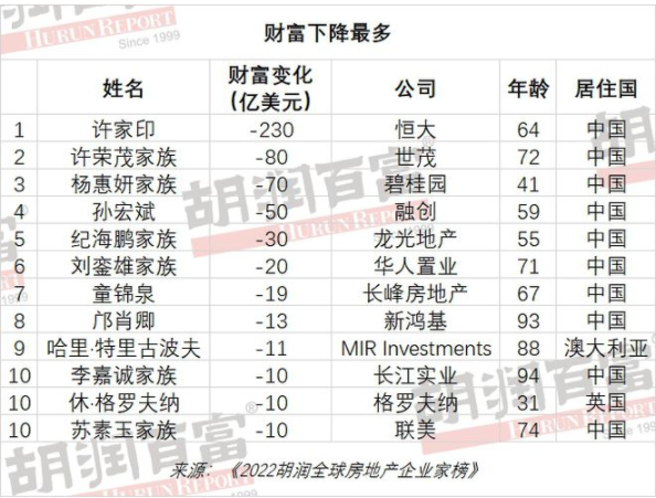 36位房地產(chǎn)企業(yè)家財(cái)富比去年下降,其中中國占三分之二(24位),財(cái)富下降最多的是恒大64歲的許家印,減少了1500億元。
