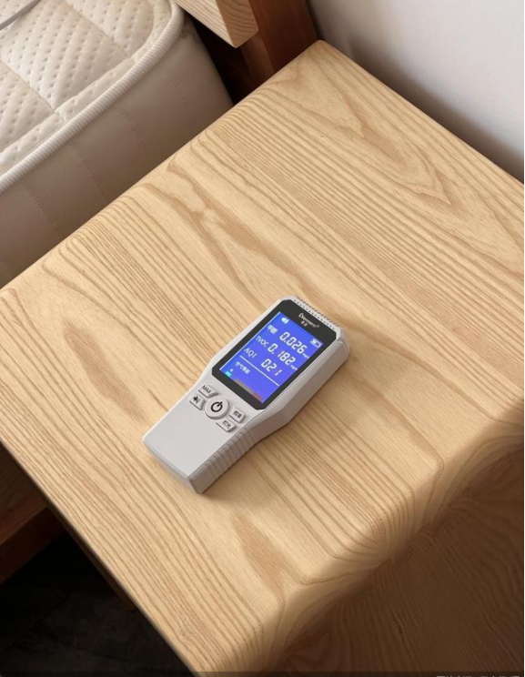 據(jù)黃女士介紹,為了能盡快入住,她已經(jīng)開窗通風(fēng)了幾個(gè)月,但仍然不太放心。由于黃女士長(zhǎng)期在外教學(xué)和演出,很少回新家住,為了測(cè)試家具中的甲醛是否完全散去,在前一天晚上將窗戶全部封閉了12個(gè)小時(shí),再將甲醛檢測(cè)儀放在厭式房間的家具上,結(jié)果顯示床頭柜的甲醛數(shù)值達(dá)到了0.299mg/m³,TVOC(總揮發(fā)性有機(jī)化合物)的數(shù)值達(dá)到了2.401mg/m³;餐桌的甲醛釋放量達(dá)到了0.32mg/m³,TVOC(總揮發(fā)性有機(jī)化合物)的數(shù)值達(dá)到了3.533mg/m³。床頭柜和餐桌的甲醛含量分別超標(biāo)2.4倍和2.5倍,AQI(空氣質(zhì)量指數(shù))顯示均為“輕度污染”。