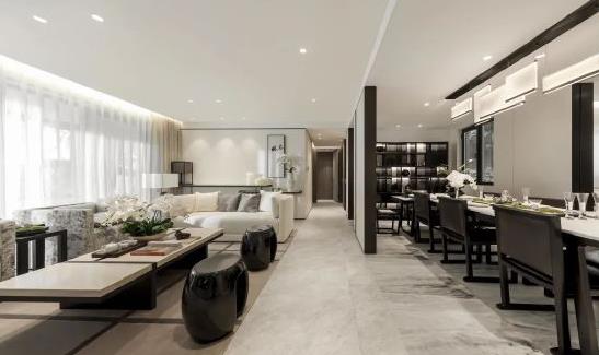 建面約142㎡戶型的采用大橫廳設(shè)計(jì),客廳面寬達(dá)到了5.8米,采用青白色的高級(jí)石材巖板,并保留了電動(dòng)窗簾的空間,保持了審美上的整體性。