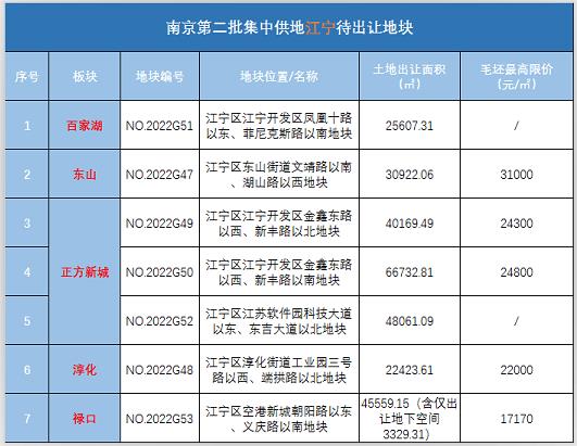 本次集中供地江寧共掛出涉宅地塊7幅:百家湖、東山各1幅、正方新城3幅、祿口、淳化各1幅。