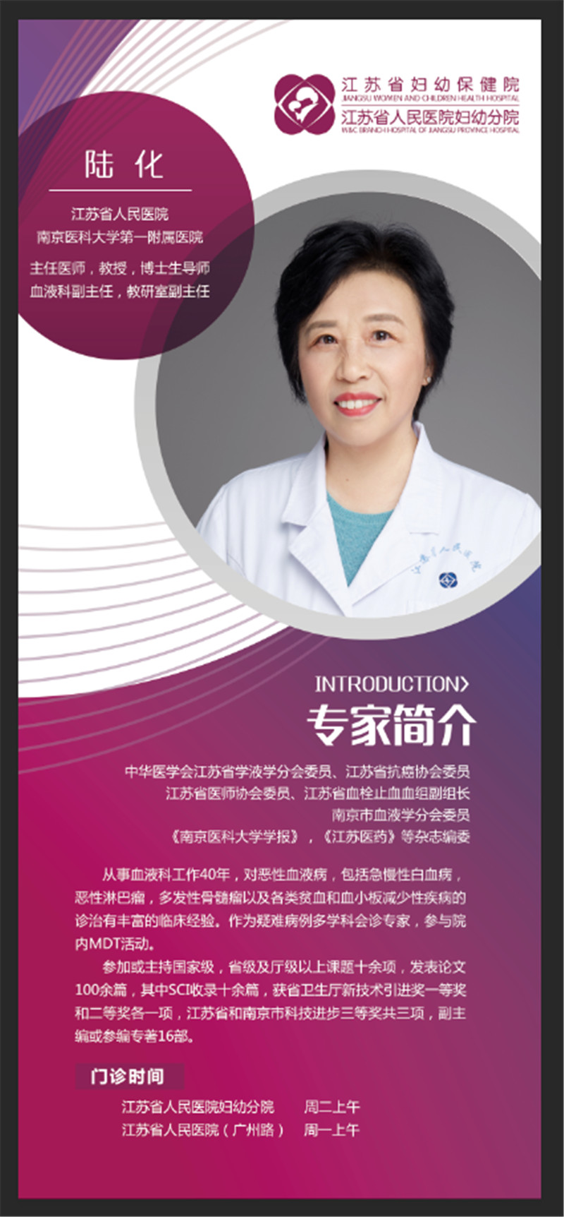 自2021年1月19日,江蘇省婦幼保健院、江蘇省人民醫(yī)院婦幼分院血液病門診已正式開診,由江蘇省人民醫(yī)院血液科陸化主任醫(yī)師定期坐診。陸化主任是省內(nèi)血液病治療領(lǐng)域的知名專家,從事血液科工作40年,對惡性血液病,包括急慢性白血病,惡性淋巴瘤,多發(fā)性骨髓瘤以及各類貧血和血小板減少性疾病的診治有著豐富的臨床經(jīng)驗,同時是江蘇省人民醫(yī)院疑難病例會診專家。