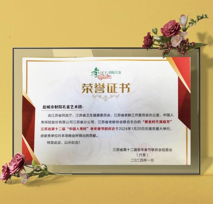 2024年1月20日,在江蘇省民政廳、江蘇省衛(wèi)生健康委員會、江蘇省老齡工作委員會辦公室、中國人壽保險股份有限公司江蘇省分公司、江蘇省老齡協(xié)會聯(lián)合主辦的“黃金時代滿庭芳”江蘇省第十二屆“中國人壽杯”老年春節(jié)聯(lián)歡會上,射陽孔雀藝術團呂雀萍老師和黃亞清老師編導的民俗歌舞《漁港豐情》代表鹽城市參加了今年的晚會,演出期間掌聲滔滔不絕,贏得現(xiàn)場觀眾的一致好評。