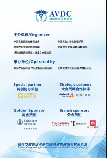 本次大會(huì)由中國(guó)農(nóng)業(yè)國(guó)際合作促進(jìn)會(huì)、中國(guó)農(nóng)業(yè)大學(xué)動(dòng)物醫(yī)學(xué)院、南京農(nóng)業(yè)大學(xué)動(dòng)物醫(yī)學(xué)院、安徽農(nóng)業(yè)大學(xué)動(dòng)物科技學(xué)院、世信朗普國(guó)際展覽(北京)有限公司主辦;由中國(guó)農(nóng)業(yè)國(guó)際合作促進(jìn)會(huì)國(guó)際會(huì)展處和北京世信興化國(guó)際咨詢公司承辦;正大集團(tuán)為特別協(xié)助單位,世紀(jì)元亨和愛德士為戰(zhàn)略合作伙伴單位和贊助,勃林格殷格翰為黃金贊助,賽默飛、泰吉科和明日達(dá)科技為分會(huì)贊助。