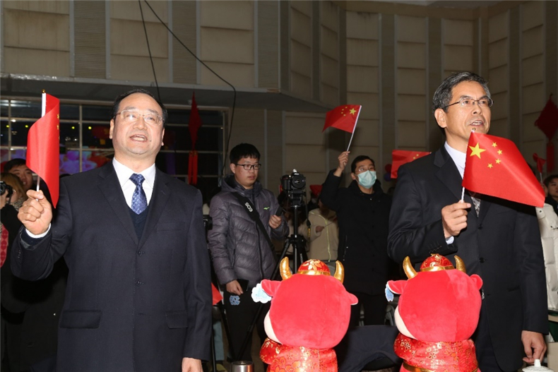 宿遷學(xué)院黨委書(shū)記徐德(左一)、校長(zhǎng)劉志遠(yuǎn)(右一)等領(lǐng)導(dǎo),在舞臺(tái)下與臺(tái)上演出師生一起激情演唱《歌唱祖國(guó)》 (中國(guó)攝影家協(xié)會(huì)會(huì)員 劉 峰 攝影報(bào)道)