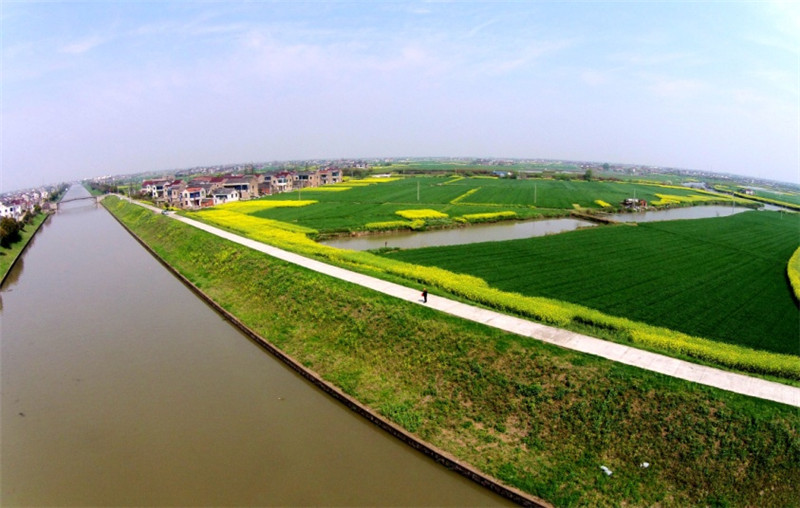 建昌圩地處常州金壇西北部直溪鎮(zhèn)境內(nèi),頭枕蜿蜒蔥蘢的茅山松濤,懷抱明月般清澈的天荒湖,橫亙綿延106平方公里于青山綠水間,乃太湖流域第一大圩。