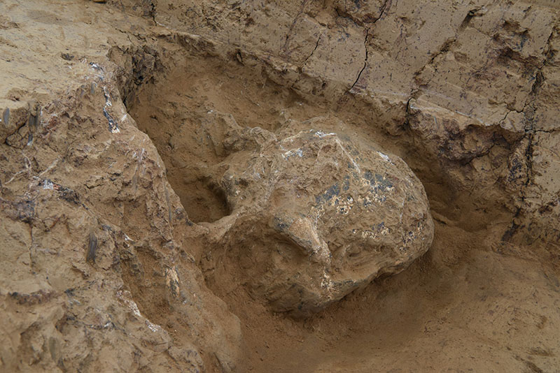 湖北十堰學堂梁子遺址發(fā)掘現場被命名為“鄖縣人3號頭骨”古人類頭骨化石出土情況(國家文物局供圖)。