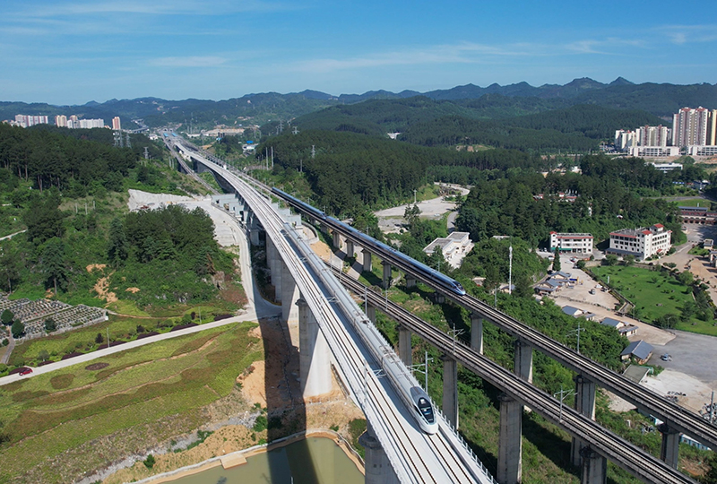 7月5日,參與試驗的55301次列車(左)行駛在貴州省龍里縣境內(nèi)(無人機照片)。