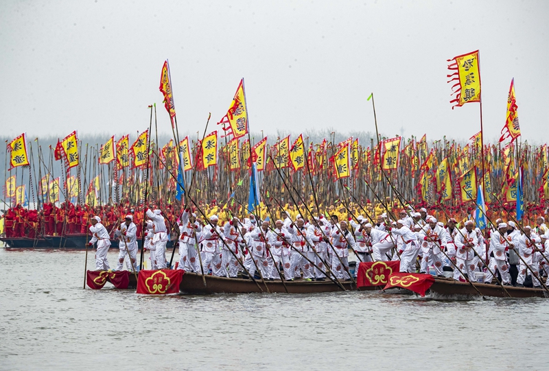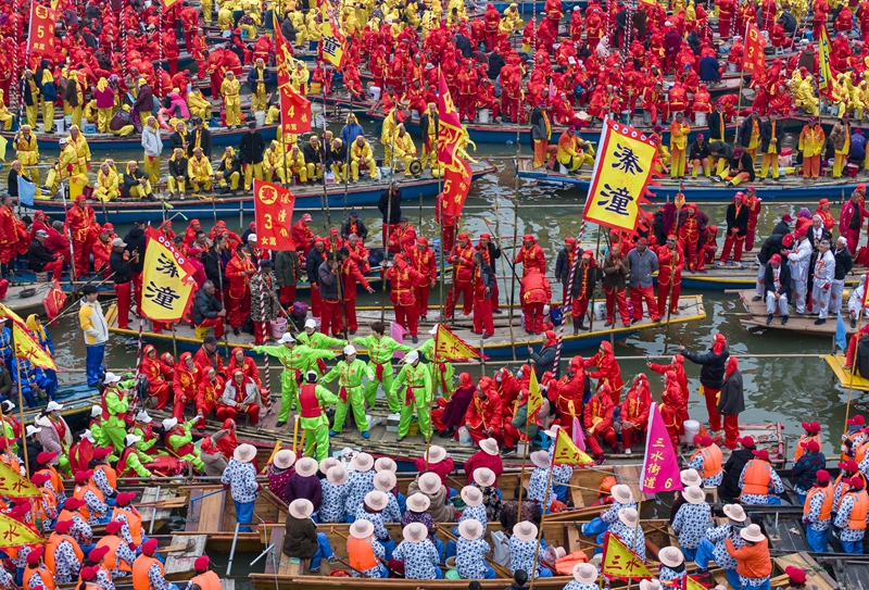 當(dāng)日,2024年泰州姜堰溱潼會(huì)船在江蘇省泰州市姜堰區(qū)溱湖國家濕地公園開幕,數(shù)百條各式各樣的船只和上萬名會(huì)船選手云集溱湖,飛篙走槳,奮勇爭先,呈現(xiàn)“千篙萬槳鬧溱湖 百舸爭流逐春潮”的壯觀場景,演繹歷久彌新的民俗畫卷。溱潼會(huì)船由南宋相沿至今,歷經(jīng)數(shù)百年傳承,被列入國家級(jí)非物質(zhì)文化遺產(chǎn)名錄。