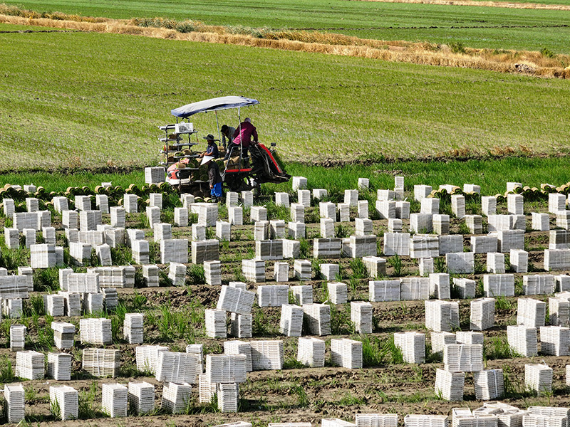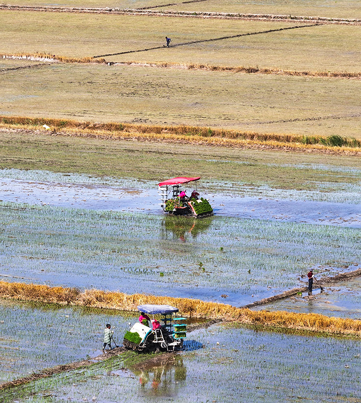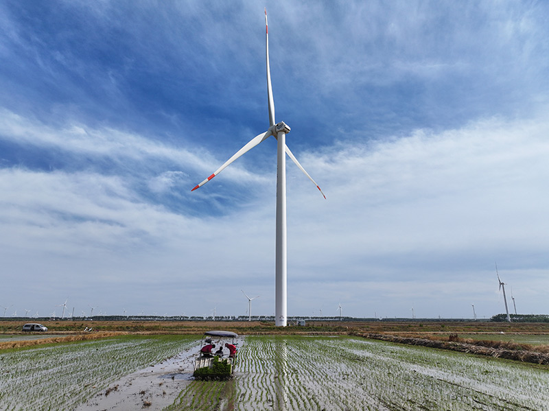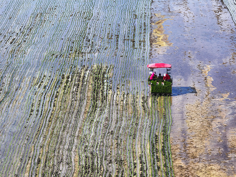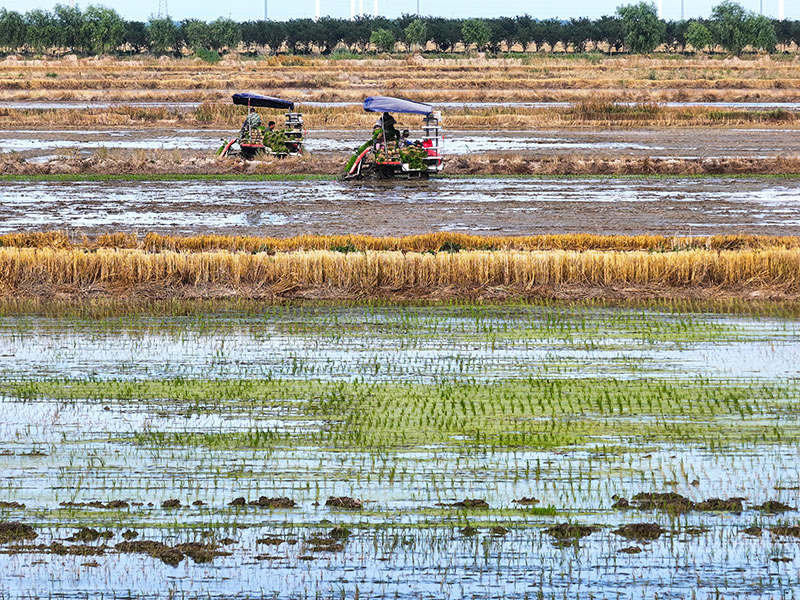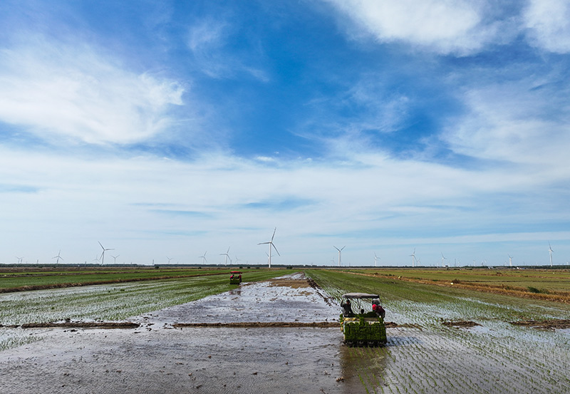 “三夏”時(shí)節(jié),位于江蘇省鹽城市射陽(yáng)縣的江蘇農(nóng)墾臨海農(nóng)場(chǎng)搶抓農(nóng)時(shí),開展機(jī)械化插秧作業(yè)。農(nóng)人、農(nóng)機(jī)、風(fēng)車在藍(lán)天白云映襯下,構(gòu)成一幅幅美麗的鄉(xiāng)村圖畫。據(jù)了解,今年臨海農(nóng)場(chǎng)水稻種植面積8.4萬(wàn)余畝,目前插秧作業(yè)已完成過半。