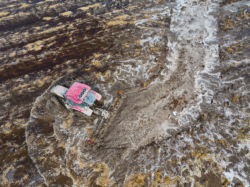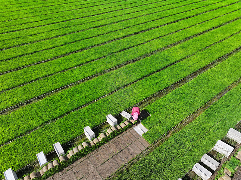 6月18日,農(nóng)業(yè)機(jī)械在臨海農(nóng)場(chǎng)一塊水田進(jìn)行起漿作業(yè)(無(wú)人機(jī)照片)。新華社記者 季春鵬 攝