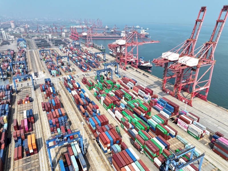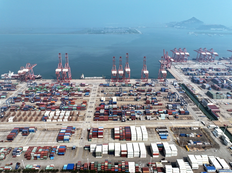 8月24日,在江蘇省連云港港集裝箱碼頭,貨輪正在裝卸集裝箱(無人機照片)。新華社發(fā)(王春 攝)