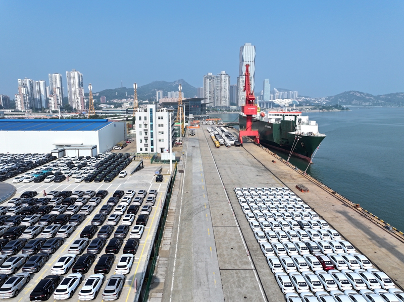 8月24日,在江蘇省連云港港東方港務(wù)分公司碼頭,滾裝輪正在裝載出口車輛(無人機照片)。新華社發(fā)(王春 攝)