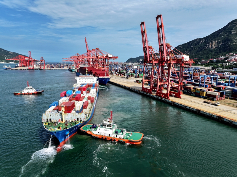 一艘貨輪滿載集裝箱緩緩駛離江蘇省連云港港集裝箱碼頭泊位(8月15日攝,無人機照片)。新華社發(fā)(王春 攝)