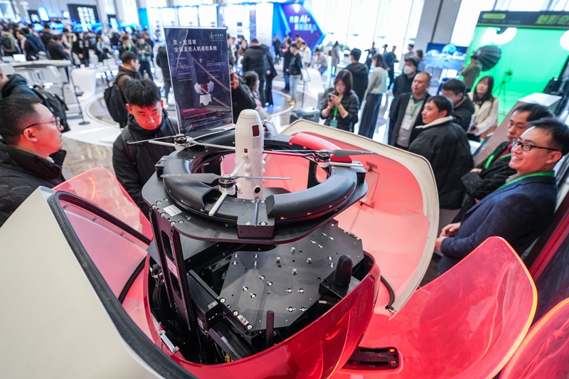 2月14日,觀眾在活動現(xiàn)場參觀全自主無人機巡檢系統(tǒng)。新華社記者 李博 攝