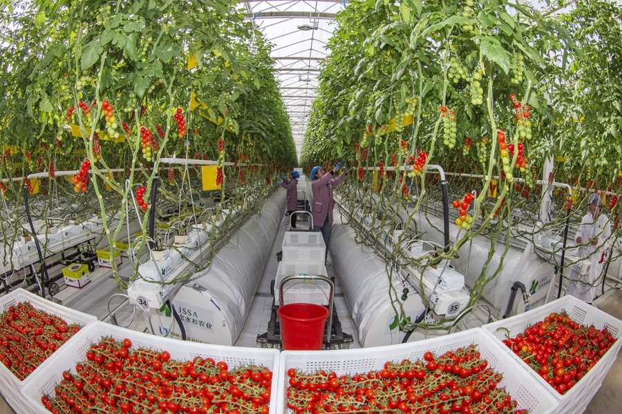 無土栽培,水肥滴灌,一串串水果番茄水靈靈、紅彤彤。近日,記者來到江蘇邳州市戴圩街道的綠色生態(tài)水果番茄項(xiàng)目基地,在一處上萬平方米的玻璃溫室內(nèi)探尋當(dāng)?shù)剞r(nóng)業(yè)新質(zhì)生產(chǎn)力。溫室內(nèi),番茄栽培架整齊排列,秧苗植根于一塊塊巖棉里,技術(shù)人員根據(jù)植株不同階段的生長(zhǎng)需要調(diào)整營(yíng)養(yǎng)配方。據(jù)邳州金水杉農(nóng)業(yè)科技有限公司生產(chǎn)技術(shù)部總監(jiān)程勝利介紹,這里采用了國(guó)際先進(jìn)的普瑞瓦溫室中控系統(tǒng),可以實(shí)現(xiàn)水、肥、溫、光、氣等100%智能化調(diào)控。值得一提的是,一只只熊蜂穿梭在枝頭間,它們厚重的絨毛攜帶的花粉量是普通蜜蜂的三倍,由此成為助力番茄生產(chǎn)提質(zhì)增效的“授粉神器”?!爸腔坜r(nóng)業(yè)帶來的不光是產(chǎn)量保障,更重要的是口感自然?!背虅倮f,每株水果番茄的生長(zhǎng)周期為1年,期間能長(zhǎng)出約50串果實(shí),基地目前每天采收量在6-8噸。據(jù)了解,該公司種植園規(guī)模達(dá)700多畝,項(xiàng)目一期帶動(dòng)當(dāng)?shù)?50多人就業(yè),二期、三期建成后預(yù)計(jì)能帶動(dòng)約500人就業(yè)。作為國(guó)有控股企業(yè),它還通過提供種苗、技術(shù)指導(dǎo)和銷售渠道,帶動(dòng)一批農(nóng)戶增收致富、共享發(fā)展紅利,形成了從生產(chǎn)到銷售的現(xiàn)代農(nóng)業(yè)產(chǎn)業(yè)鏈閉環(huán)。