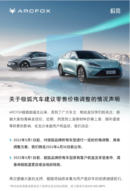 IT之家了解到,極狐汽車表示,受到上游原材料價格上漲.國補(bǔ)退坡等因素的影響,其決定2022 年 5 月 1 日起,對極狐品牌所有車型進(jìn)行一定的價格調(diào)整,具體調(diào)整方案將在 2022 年 4 月 30 日前公布。
