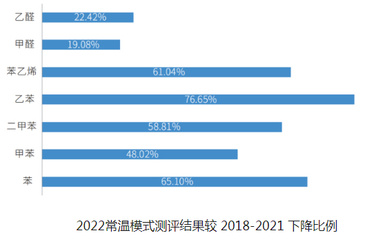 2022年度車內(nèi)空氣質(zhì)量測評結果顯示,常溫狀態(tài)下,除丙烯醛外,其余7種揮發(fā)性有機物均較2018-2021年有不同程度下降,一類致癌物甲醛和苯分別下降19.08%和65.10%,其余五種物質(zhì)也分別有22.42%至76.65%的下降。