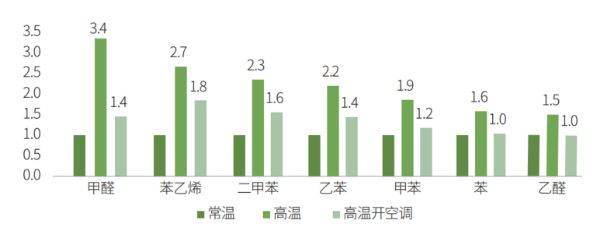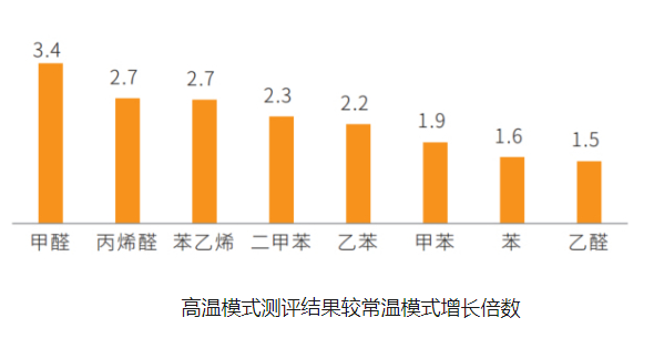 高溫模式下的揮發(fā)性有機物測評結果不如人意,濃度平均為常溫下的2倍。甲醛、乙醛、二甲苯和苯乙烯分別為常溫模式的3.8倍、1.5倍、2.3倍和2.7倍。由此可見,消費者“溫度越高,車里味道越大”的樸素感知與測試結果相符,高溫下的車內(nèi)污染問題亟待解決。