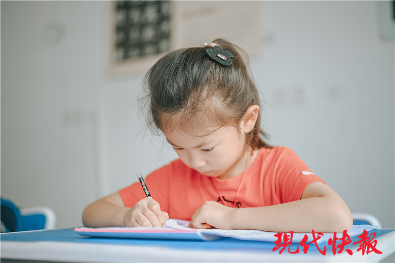 現(xiàn)代快報記者來到現(xiàn)場,只見一名穿著紅衣服的小女孩非常顯眼。她端坐在書桌前,一筆一畫寫著唐詩。“我很喜歡寫字,每天回家也會練字一個小時。”這個叫黃舒涵的小朋友說到書法,露出了開心的笑容。