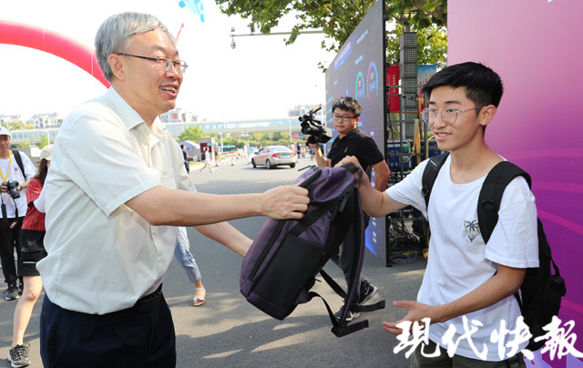 當(dāng)天,南京大學(xué)黨委書記胡金波、校長呂建也來到迎新現(xiàn)場,與來自“五湖四海”的萌新們親切交流,并送上南京大學(xué)吉祥物“小藍(lán)鯨”玩偶。