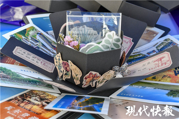 打開驚喜盒的第一層“致未來”,里面是給新生的大學(xué)四年的學(xué)業(yè)規(guī)劃、未來的職業(yè)等內(nèi)容的規(guī)劃書,學(xué)生可以用四年的時(shí)間來填滿空白處。第二層“致經(jīng)典”,里面有學(xué)院給新生推薦的閱讀書籍《中國文化史》《鄉(xiāng)土中國》《理想國》《疾病改變歷史》等書目及其簡介和一張讀書卡。第三層打開后,則是令人賞心悅目的校園經(jīng)典打卡美景。第四層里填滿了高年級(jí)學(xué)長手寫給新生的心里話“夢(mèng)想就是夢(mèng)里想的,醒來就能做的事。”“什么都不做,才會(huì)來不及。”揭開最上面的一層,有干花、花種和一張“南京站”到“未來站”的入學(xué)車票。