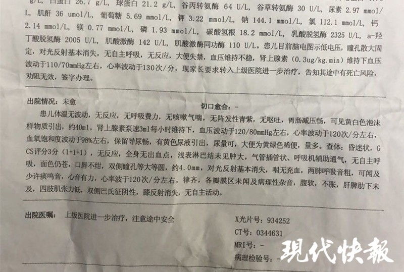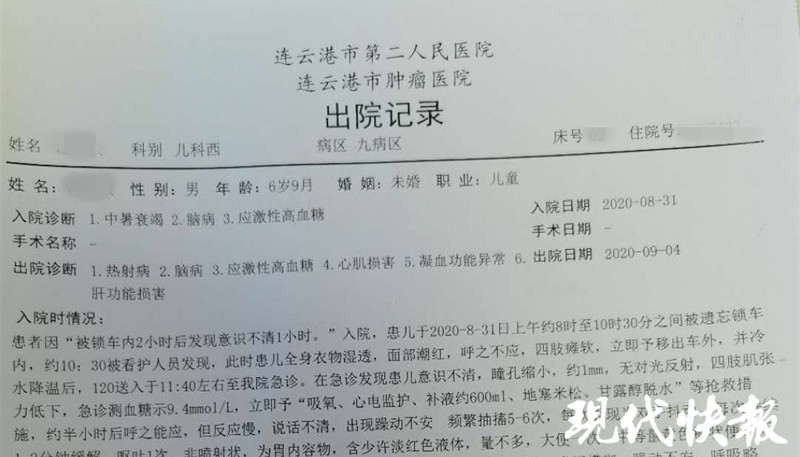 醫(yī)院診斷報(bào)告顯示,文文和瑞瑞于8點(diǎn)至10點(diǎn)30分之間被鎖車內(nèi)。被發(fā)現(xiàn)時(shí),兩個(gè)孩子“全身衣物濕透,面部潮紅,呼之不應(yīng),四肢癱軟”。其中,哥哥文文被診斷患有熱射病、腦病和應(yīng)激性高血糖。弟弟瑞瑞的狀況則較為嚴(yán)重,且持續(xù)昏迷不醒。醫(yī)生當(dāng)場(chǎng)就開(kāi)出了兩份病危通知書(shū)。