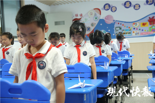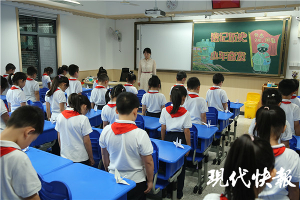 “特別提醒各位同學(xué),今天警報聲響起時,請你放下手中的事,停下腳步,靜靜地站在原地默哀。”南師附小大隊(duì)輔導(dǎo)員胡穎告訴記者,希望每位同學(xué)銘記這個屈辱的日子,為戰(zhàn)爭中無數(shù)的英烈悼念、默哀,學(xué)校在每個班級門口都掛起了國旗,還在防空警報響起前開設(shè)了一節(jié)晨會課,通過廣播的形式,告訴同學(xué)們九一八事變的這段歷史,希望他們珍愛和平、勤奮學(xué)習(xí)、嚴(yán)于律己、報效祖國。