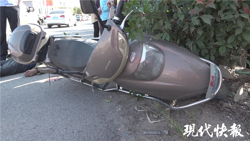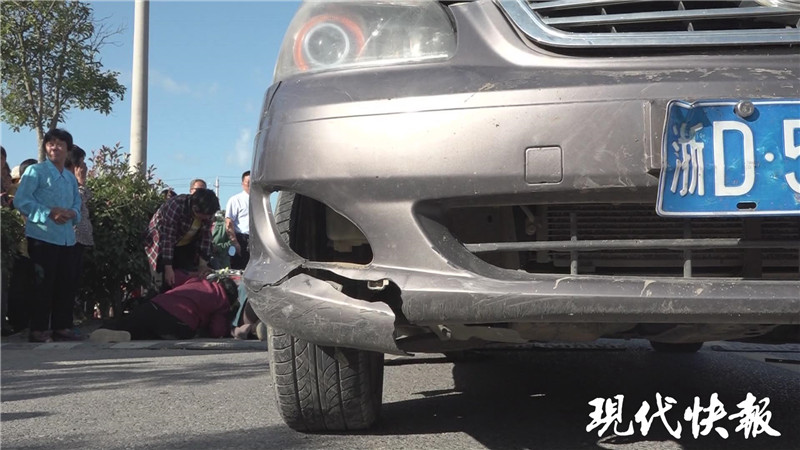 事發(fā)現(xiàn)場位于射陽縣長蕩鎮(zhèn)幼兒園北側的一個無燈控十字路口?,F(xiàn)代快報記者在現(xiàn)場看到,一名身穿黃大衣的老人仰面躺在路邊,已無生命體征,地面有一攤血跡。一輛電動自行車倒在旁邊的綠化樹下,肇事私家車的前保險杠開裂,車牌照彎曲變形。