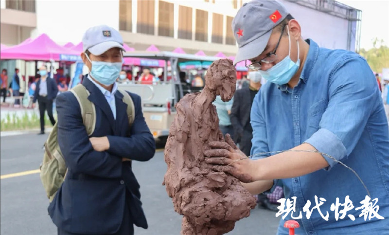 除了迎新禮物外,常大美術(shù)與設(shè)計(jì)學(xué)院的同學(xué)還迎來(lái)了進(jìn)校來(lái)的第一次“現(xiàn)場(chǎng)教學(xué)”。“在展臺(tái)前現(xiàn)場(chǎng)做泥塑的是我們的一位大四學(xué)生,通過(guò)現(xiàn)場(chǎng)的美術(shù)創(chuàng)作讓新生更好地了解未來(lái)的學(xué)習(xí)狀況。同時(shí)我們還為來(lái)報(bào)到的新生準(zhǔn)備了現(xiàn)場(chǎng)速寫(xiě),能夠在這迎新的活動(dòng)中留下一份難忘記憶。這邊展示的兩幅壁畫(huà)是我們學(xué)生的代表作。”學(xué)院朱睿老師解釋。