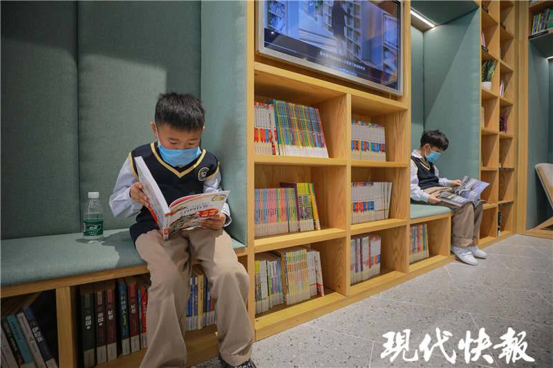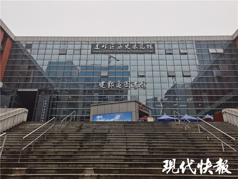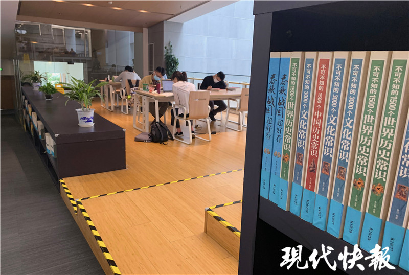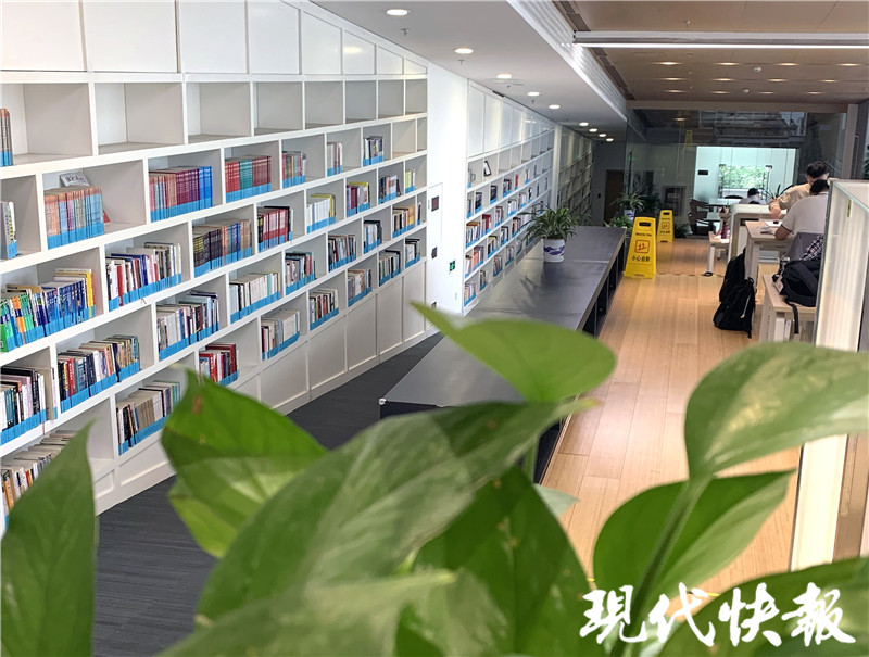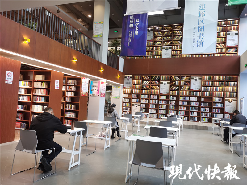 沿著高高的臺階,走上建鄴區(qū)圖書館二樓,現(xiàn)代化的玻璃幕墻包裹下,里面是一個設(shè)計風格雅致的閱讀空間。