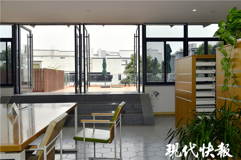 這里最讓人心動的,是閱讀區(qū)外一片開闊露臺。低頭,是隱隱帶著墨香的書籍,耳邊有蟬鳴鳥啼,和風吹動的梧桐葉;抬頭,是青磚黛瓦的江南建筑,梧桐樹蒼綠的頂冠與視線齊平。傍晚的時候,落日熔金,暮云合碧,沿著天際線遠望,是長不見尾的街巷。