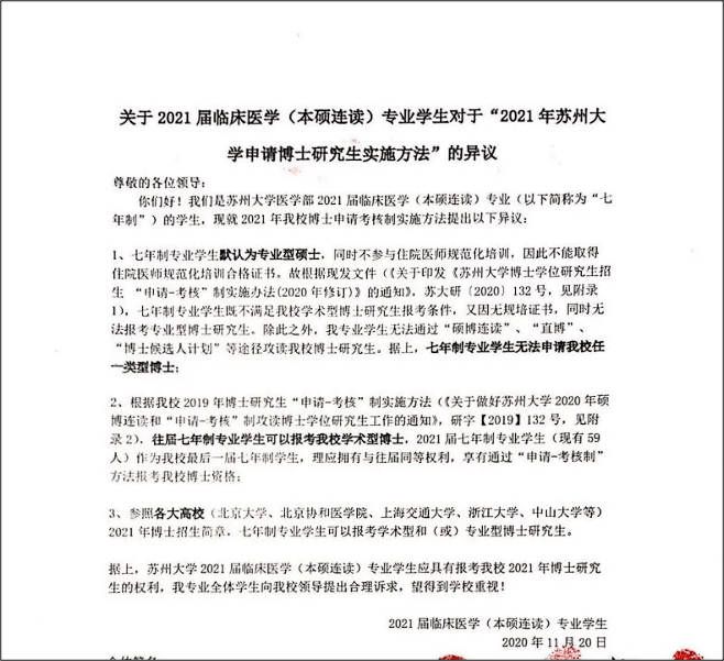 近期,一份名為「關(guān)于 2021 屆臨床醫(yī)學(xué)(本碩連讀)專業(yè)學(xué)生對(duì)于 2021 年蘇州大學(xué)申請(qǐng)博士研究生實(shí)施方法的異議」的 PDF 在網(wǎng)上流傳。
