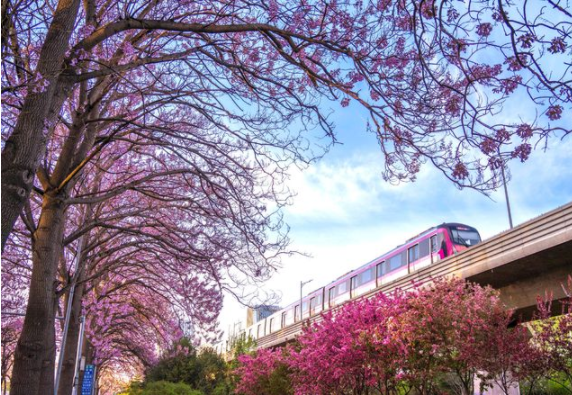 這條泡桐花隧道位于亦莊的宏達北路、宏達中路和宏達南路,在亦莊線萬源街、榮京東街、榮昌東街站下車都可以看到。泡桐花開,清香四溢,這是一條通往紫色浪漫春天的大道,全程約有5公里,可以行走在其中,也可以騎上一輛單車穿梭于此。泡桐開花有著與眾不同的春的氣息,道路兩旁一片片紫粉色的花朵,望去如同緋紅的輕云,讓人恍如隔世,醉不欲歸。亦莊線的紫色車身穿梭,與泡桐花的紫色相融合,儼然就是開往春天的地鐵。