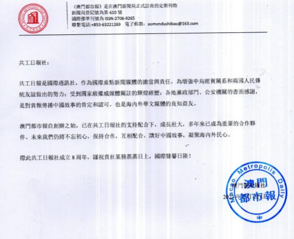 澳門都市報社致信祝賀共工日報社建社8周年