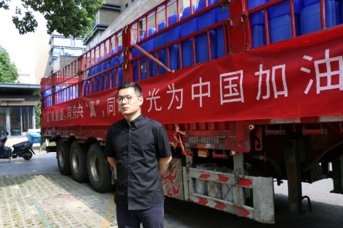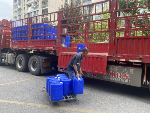 8月9日上午,志愿者們頂著驕陽將全部消毒物資裝車加固,將30余噸消毒液整齊裝車,并做好保護(hù)工作。