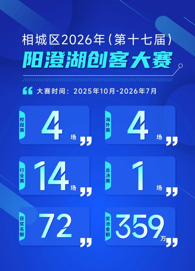 陽(yáng)澄湖畔創(chuàng)客聚,才涌相城創(chuàng)新地!為助力蘇州市及相城區(qū)重點(diǎn)產(chǎn)業(yè)發(fā)展,打造“以賽引才,才聚相城”的動(dòng)態(tài)創(chuàng)新鏈,相城區(qū)2026年(第十七屆)陽(yáng)澄湖創(chuàng)客大賽正式開(kāi)啟!