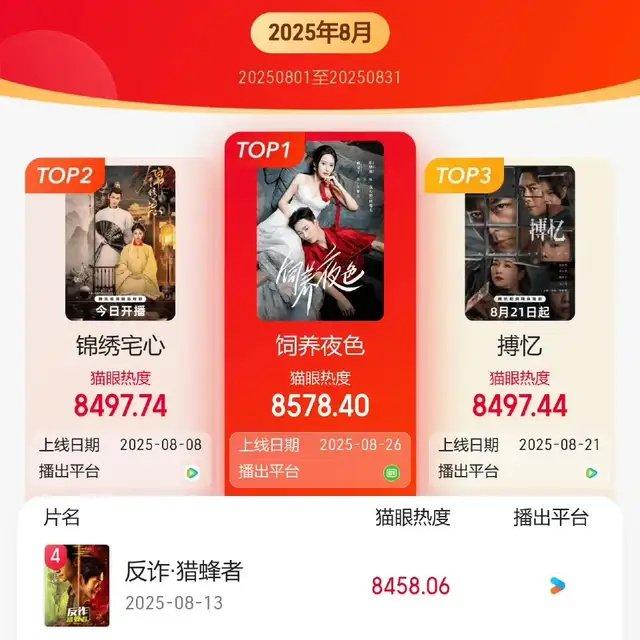 由霍建華、黃宗澤強強聯(lián)合,主演的短劇《搏憶》收官了。八月份短劇熱播排行榜上熱度僅僅排到第三,距離還比它遲將近一個星期播出的不知名演員出演的土味短劇《飼養(yǎng)夜色》,還有一定差距。