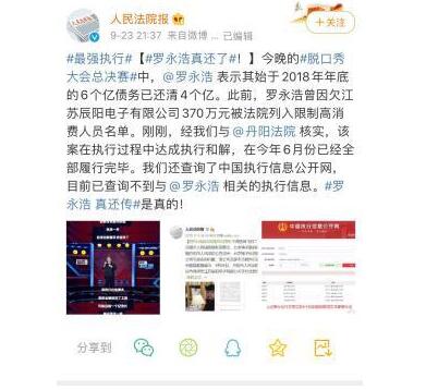 此話一出,立即引起了網(wǎng)友們的熱議。9 月 23 日晚 9:37,人民法院報(bào)官微 "@人民法院報(bào) " 發(fā)布微博,為羅永浩 " 正名 "。人民法院報(bào)稱," 此前,羅永浩曾因欠江蘇辰陽電子有限公司 370 萬元被法院列入限制高消費(fèi)人員名單。經(jīng)與江蘇省丹陽人民法院核實(shí),該案在執(zhí)行過程中達(dá)成執(zhí)行和解,在今年 6 月份已經(jīng)全部履行完畢。"9 月 24 日凌晨 1:28,羅永浩轉(zhuǎn)發(fā)了人民法院報(bào)的這條微博,并評(píng)論道 " 慚愧,感謝。"
