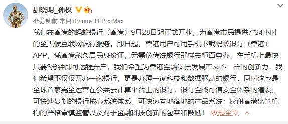 阿里旗下螞蟻集團(tuán)CEO胡曉明(花名:孫權(quán))通過(guò)個(gè)人微博宣布,螞蟻銀行(香港)已于9月28日起正式開(kāi)業(yè),為香港市民提供7×24小時(shí)全天候互聯(lián)網(wǎng)銀行服務(wù)。