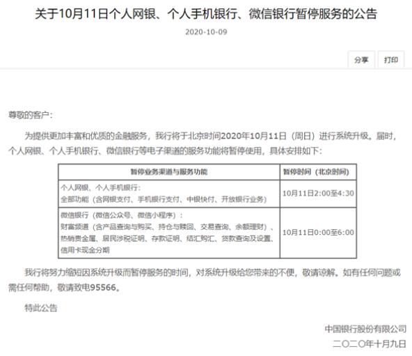根據(jù)公告,中國銀行將于北京時(shí)間2020年10月11日(周日)進(jìn)行系統(tǒng)升級。