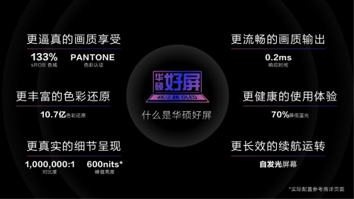 只要是擁有“華碩好屏”官方認(rèn)證的筆記本電腦,那么它的屏幕素質(zhì)無疑就有著穩(wěn)妥的保障。華碩OLED屏幕擁有2.8K / 4K分辨率,覆蓋100%DCI-P3廣色域并通過PANTONE色彩認(rèn)證、10bit色深能夠呈現(xiàn)10.7億色彩、1000000:1高對(duì)比度、0.2ms極速響應(yīng)時(shí)間、90Hz高刷新率、降低70%有害藍(lán)光,峰值亮度最高可達(dá)600nits(以產(chǎn)品具體規(guī)格為準(zhǔn)),以頂尖實(shí)力賦能生活?yuàn)蕵?、商?wù)辦公所需。